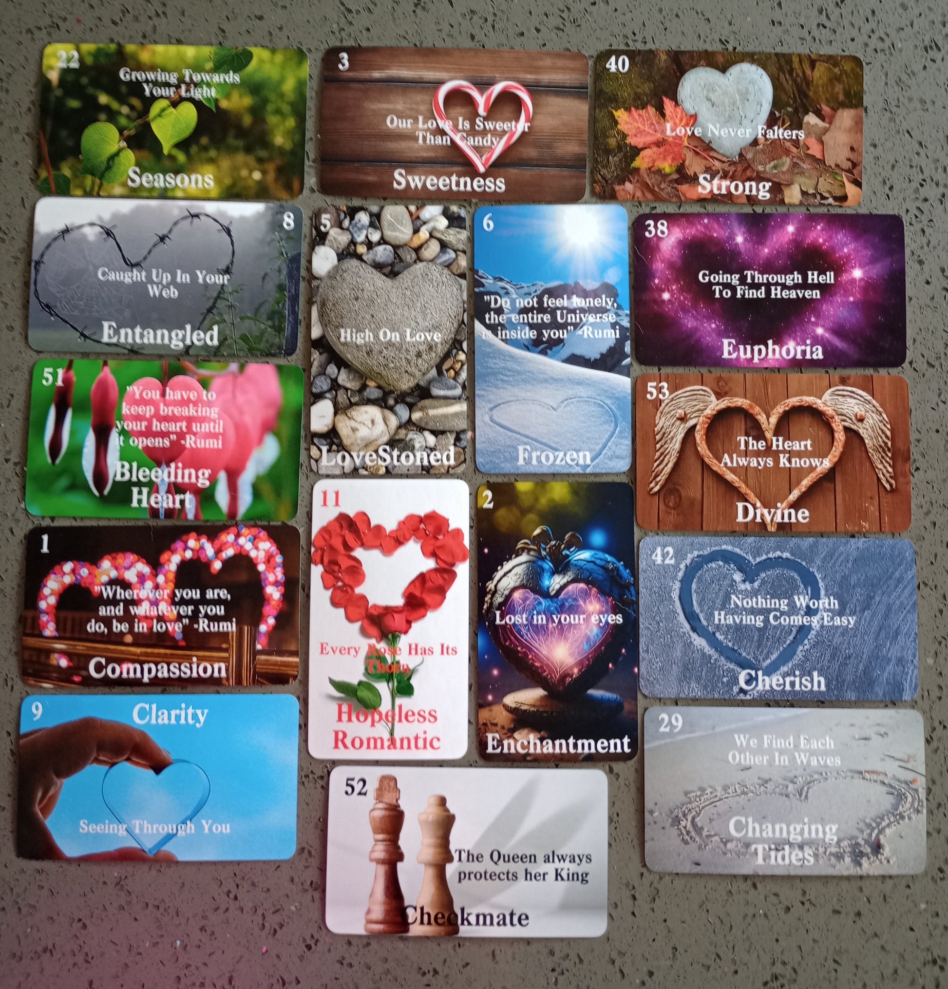Messages from the heart and poetry by Rumi. Each card has a different heart image on it. The only guidebook you need is your heart❣️